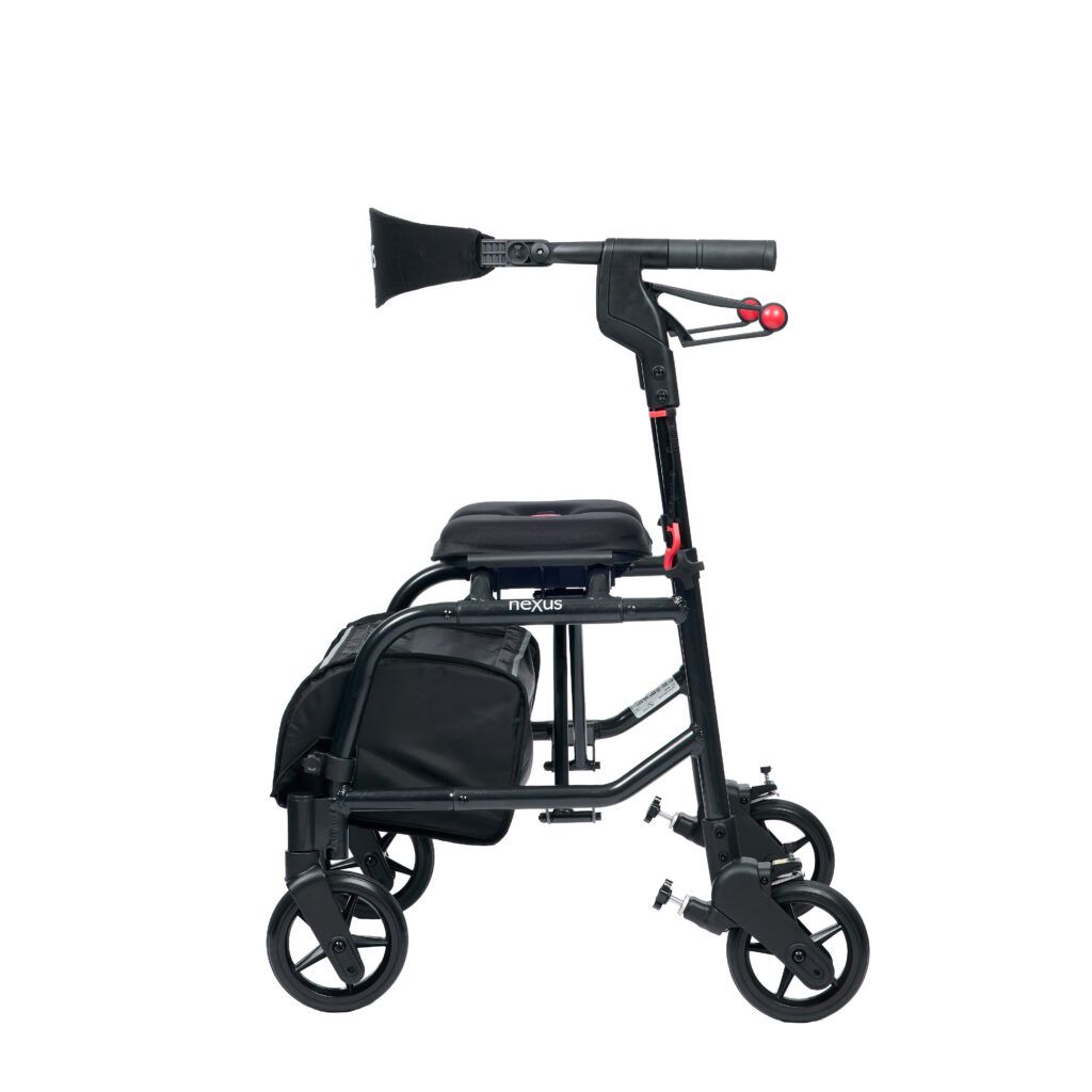 The neXus oNe features a foam cushioned seat that offers a great resting spot while walking. Although the neXus oNe is primarily for indoor use, its 6” wheels and swivel front forks make it a great rollator to navigate in smaller spaces such as the aisles in a mall store. The handle features an arthritic ball at the end, making it easier to engage and more comfortable to use.