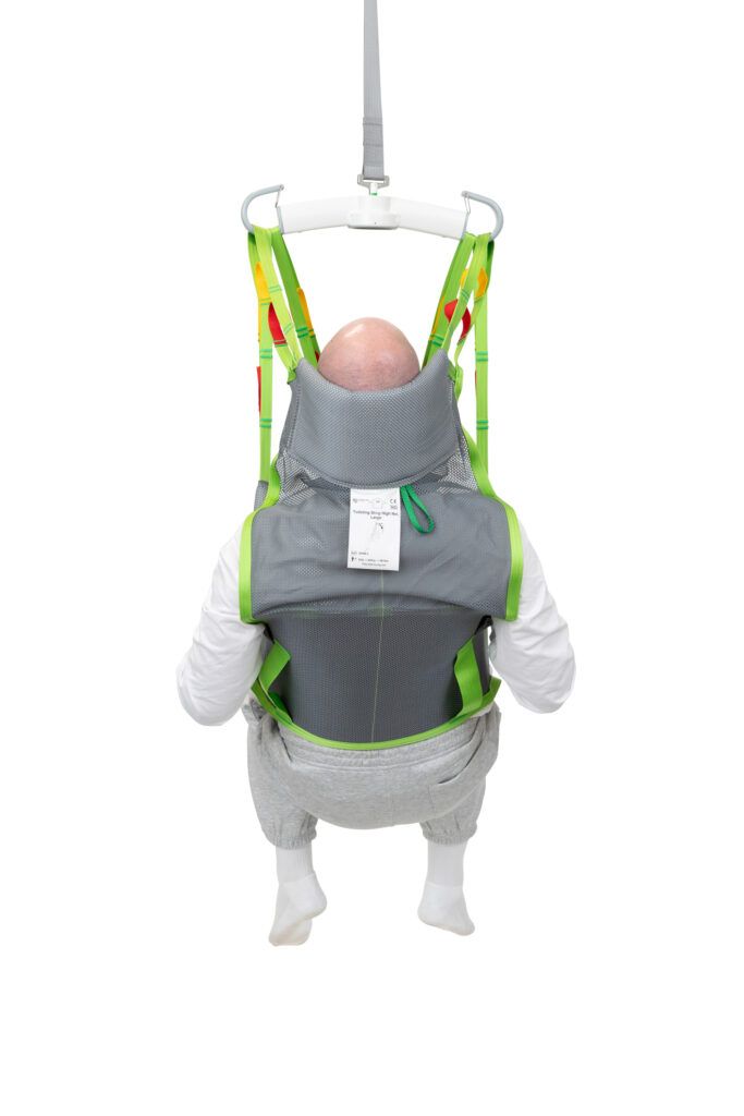 The toileting sling high has a reinforced back for added back support and padding under the arms for extra comfort. The sling has a padded and adjustable neck support that gives extra stability. The wide partition of the leg parts makes the sling application fast and simple and enables dressing and undressing during toileting or bathing. The sling’s upright sitting position makes transferring to and from toilets easier and suits patients with poor trunk and neck stability. For patients with low body stability, a waist belt is recommended, se below for kit numbers with sling and belt together.